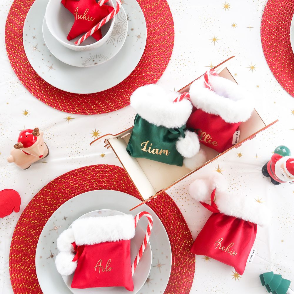 These fabulous personalised Christmas mini sacks can be used for so many different things. They make perfect place settings or favors at your Christmas dinner table. Fill them with little presents or sweets to sit underneath the Christmas tree. Versatile and delightful, they add an extra special touch to your holiday gatherings.