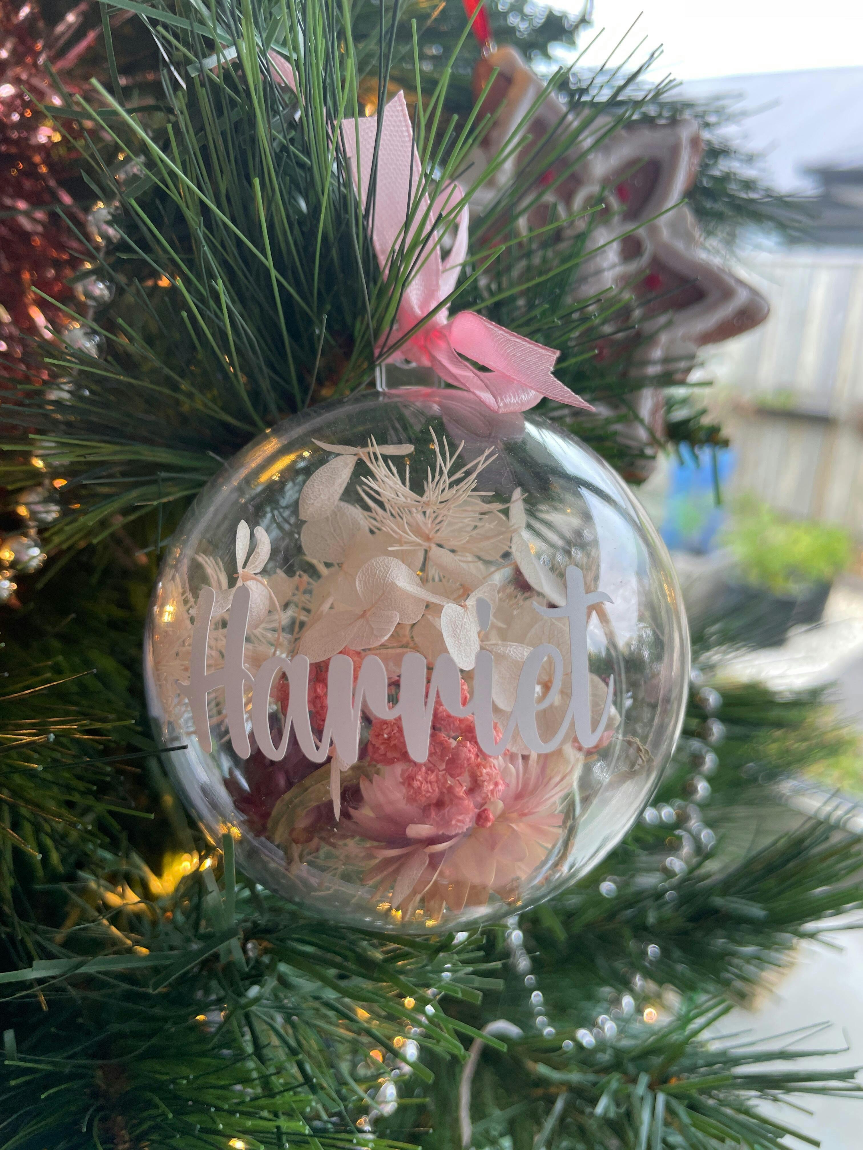 Just gorgeous! Such delicate dried flowers on the inside, and the name is added in a pretty font. Looks great on the Christmas tree