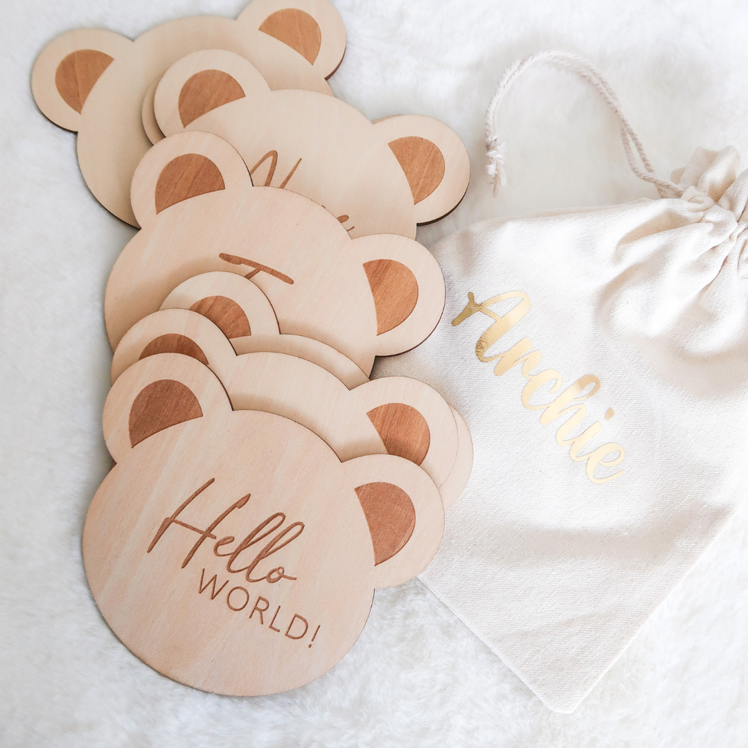 Crafted from natural wood with engraved details, these monthly milestone cards are the perfect way to capture your baby's precious first year moments. Each set comes beautifully packaged in a drawstring bag, which can be personalized with your baby's name or a name of your choice (e.g. Baby Smith), adding an extra special touch to this already delightful keepsake.