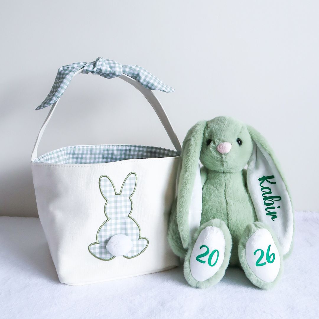 Personalised Easter Bunny Canvas Basket (Green) – A charming, reusable basket personalised with your child's name, perfect for filling with additional gifts, Easter treats, and hunting for eggs.