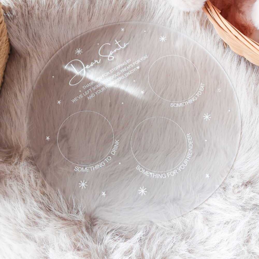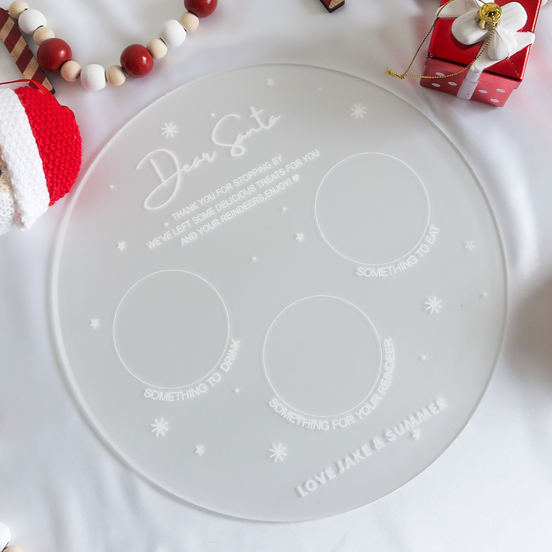 Elevate your holiday tradition with our sleek, clear acrylic Santa plate. Customize it with your child's name or family name, creating a moment that spells out "Love."
